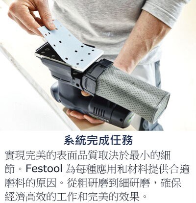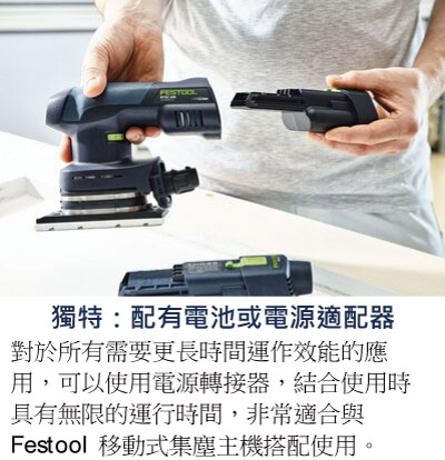 *更換插入電源適配器可為電動研磨機,在連續供電下操作使用,具有無限的運行時間-與Festool移動式集塵主機,結合使用的理想之選